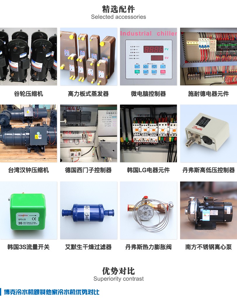 ②博克小型箱式冷水機(jī)部分采用銅盤管式換熱器作蒸發(fā)器,為獲取更大的制冷量,銅盤管長度比別家長一倍。