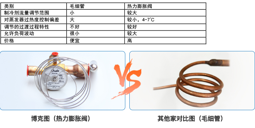 4、博克節(jié)流閥采用丹弗斯/艾默生外平衡熱力膨脹閥控制,溫度調(diào)節(jié)范圍廣,制冷劑流量自動控制,機(jī)組運(yùn)行十分穩(wěn)定,能效比優(yōu),與目前市場上普遍采用的毛細(xì)管節(jié)流相比,具有無可比擬的優(yōu)越性。當(dāng)工況如環(huán)境溫度、要求的水溫、熱負(fù)荷等變化時,毛細(xì)管無法自我調(diào)節(jié),此時制冷量下降,同時可能會造成壓縮機(jī)排氣溫度過高、潤滑性下降或液擊,直接影響機(jī)組的使用壽命,嚴(yán)重時制冷系統(tǒng)無法正常工作。