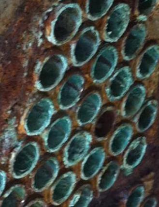 冷卻水一般都是用自來水作為補充,水里會有微量的鈣、鎂等離子。由于冷卻塔主要靠水分蒸發(fā)吸收熱量來給水降溫,這樣水中的鈣、鎂等離子濃度會不斷增加,最后會以CaSO4、CaCO3、Mg(OH)2、MgCO3等形式析出,造成冷凝器結(jié)垢。很多用地下水作為冷卻水基本上都是這種結(jié)垢形式。