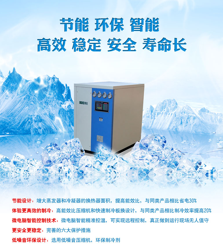 博克整合世界知名供應商資源訂購每個機組部件,確保冷水機高品質(zhì)高性能,是您值得信賴的冷水機生產(chǎn)廠家。冷水機高效節(jié)能,操作方便,使用壽命長達10年以上,廣泛應用于塑膠、電子、機械、鑄造、包裝印刷、化工醫(yī)藥、實驗、食品、養(yǎng)殖、電鍍、激光、冶金、建筑、環(huán)保等行業(yè)。