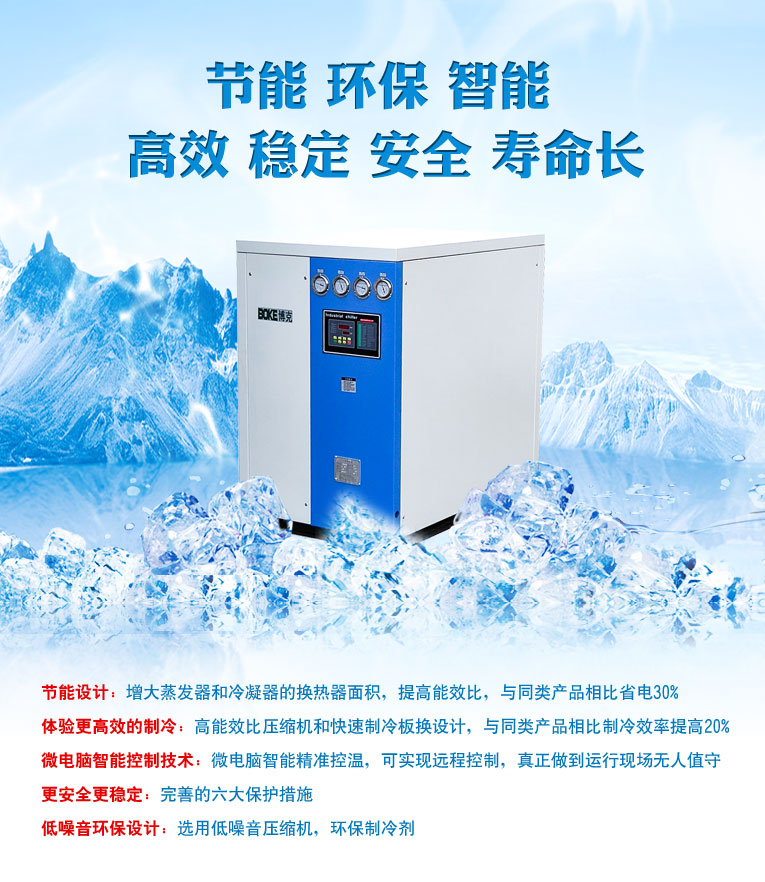 博克整合世界知名供應(yīng)商資源訂購每個(gè)機(jī)組部件,確保冷水機(jī)高品質(zhì)高性能,是您值得信賴的冷水機(jī)生產(chǎn)廠家。冷水機(jī)高效節(jié)能,操作方便,使用壽命長達(dá)10年以上,廣泛應(yīng)用于塑膠、電子、機(jī)械、鑄造、包裝印刷、化工醫(yī)藥、實(shí)驗(yàn)、食品、養(yǎng)殖、電鍍、激光、冶金、建筑、環(huán)保等行業(yè)。