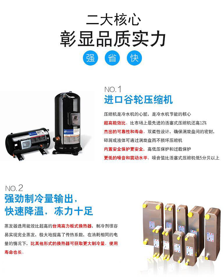 1)采用進(jìn)口谷輪等歐美知名品牌中溫型壓縮機(jī),內(nèi)置安全保護(hù),制冷系數(shù)大,噪音低,省電耐用,安全可靠,壽命長(zhǎng)。
