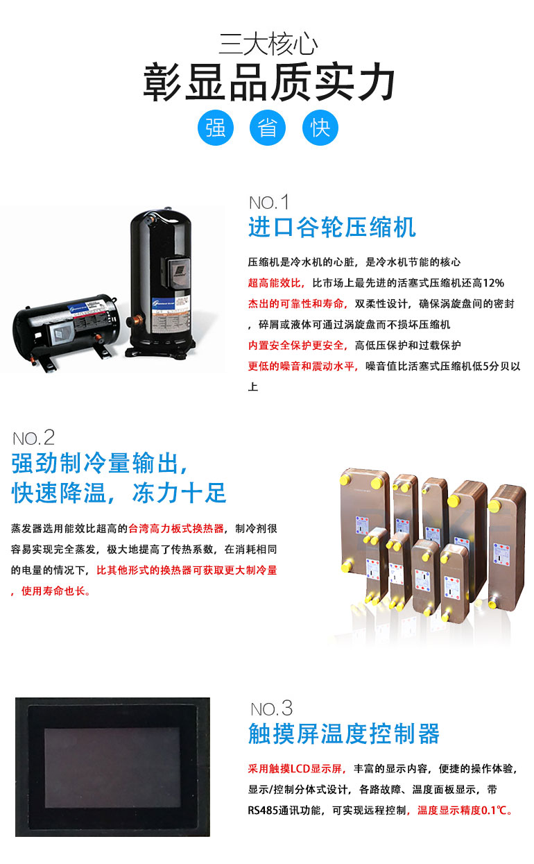 2)制冷壓縮機(jī)選用美國谷輪全封閉渦旋式壓縮機(jī),內(nèi)置安全保護(hù)、低噪音、省電耐用,比常規(guī)的大金、松下、三洋等日本品牌運(yùn)行穩(wěn)定,能效比更高。