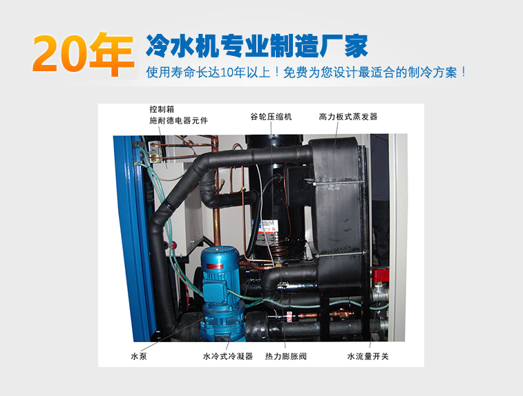 蒸發(fā)器:臺(tái)灣高力品牌板式換熱器,比普通的管殼式換熱器和水箱式換熱器制冷量更大,消耗功率反而更低,使用壽命長(zhǎng)
