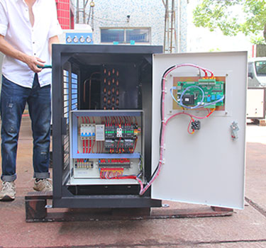 BKLS-50F風(fēng)冷式冷水機(jī)是根據(jù)客戶電磁烘干爐的形式和空余位置定制(按照客戶要求的尺寸定制),冷水機(jī)作為電磁烘干爐的一部分配套使用,并設(shè)有遠(yuǎn)程開、停機(jī)功能。